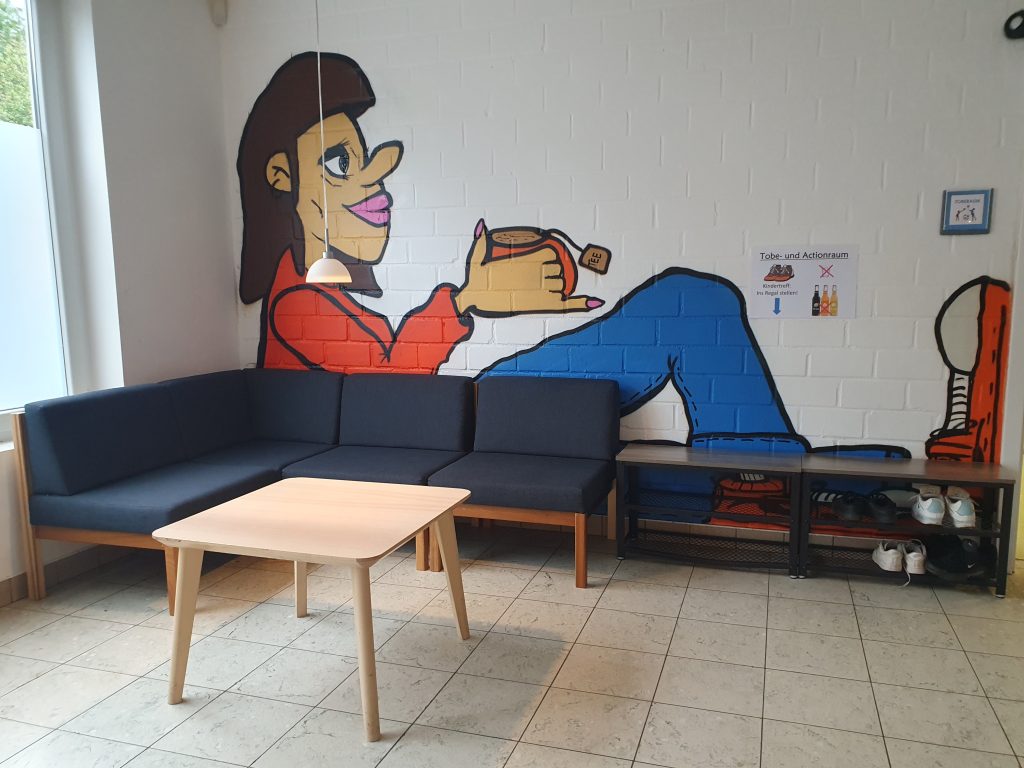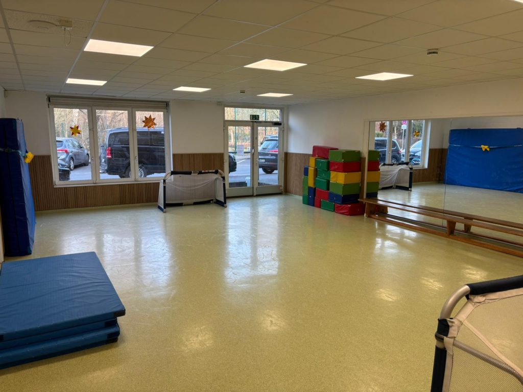 Die kleine Turnhalle ist perfekt, um sich einmal so richtig auszutoben; ob beim Turnen auf Sportmatten oder beim Bauen mit den großen Schaumstoffwürfeln. Manchmal wird er zum Stadion, wenn wir den Soccer-Cage aufbauen und ihr zu zweit oder viert die Bälle ins Tor zockt oder einfach auf dem Feld gegeneinander spielt. Neben einem kostenfreien Tanzangebot, wobei ihr euch hervorragend in den großen Spiegeln beobachten könnt, bietet der Raum ausreichend Platz für Bewegungsspiele jeglicher Art. Ihr habt euch für die älteren Jugendlichen gewünscht: Boxen. Noch nicht installiert, aber in Planung: Ein Boxsack und Equipment.