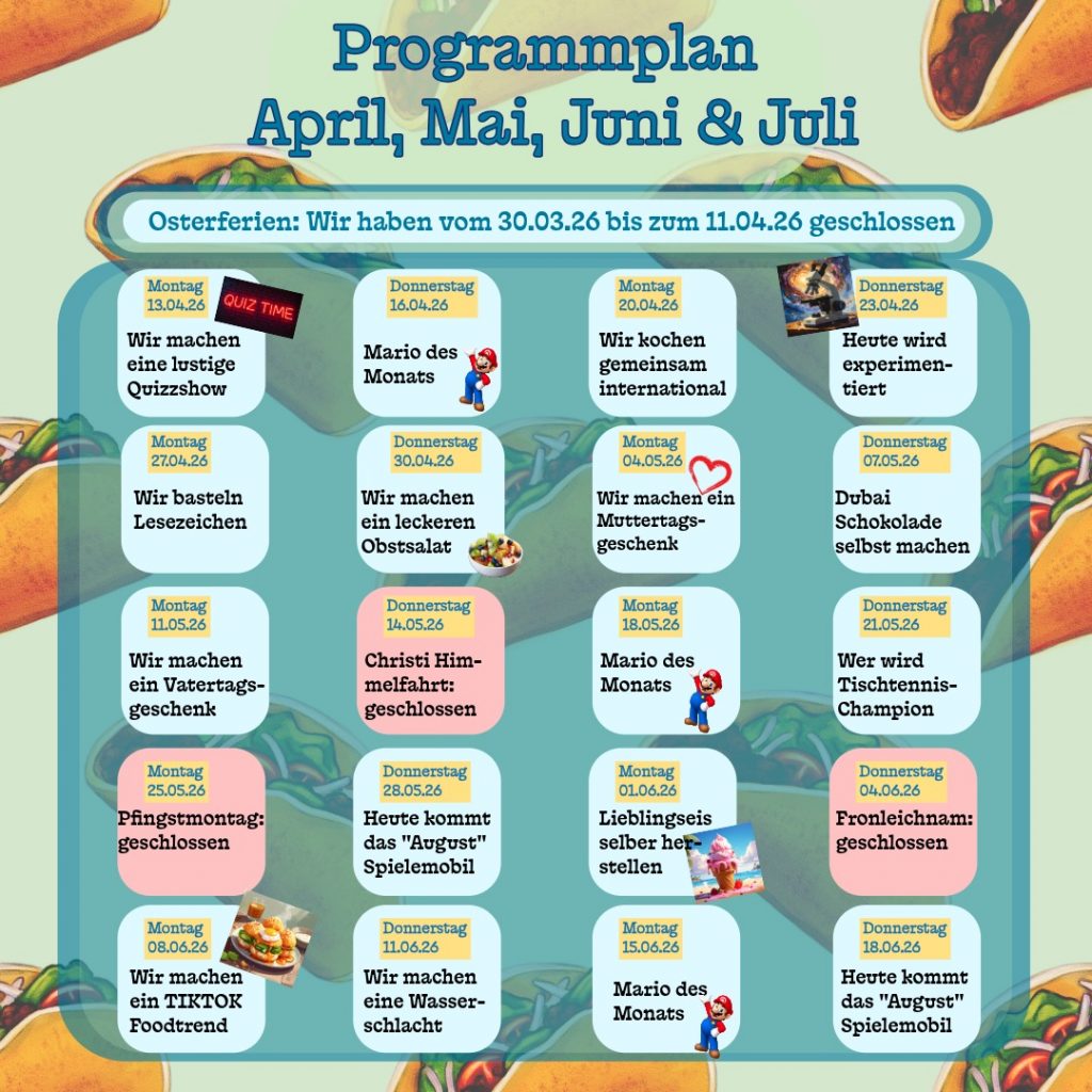 Wie in allen Offenen Einrichtungen können sich die Besucher:innen ganz frei beschäftigen, es erscheint aber auch regelmäßig ein spannendes Programm, das zu gemeinsamem Spiel, Spaß, Kochen, Backen, Sport, Kreativität und zur Interaktion, Kommunikation und zum Austausch einlädt und anregt!